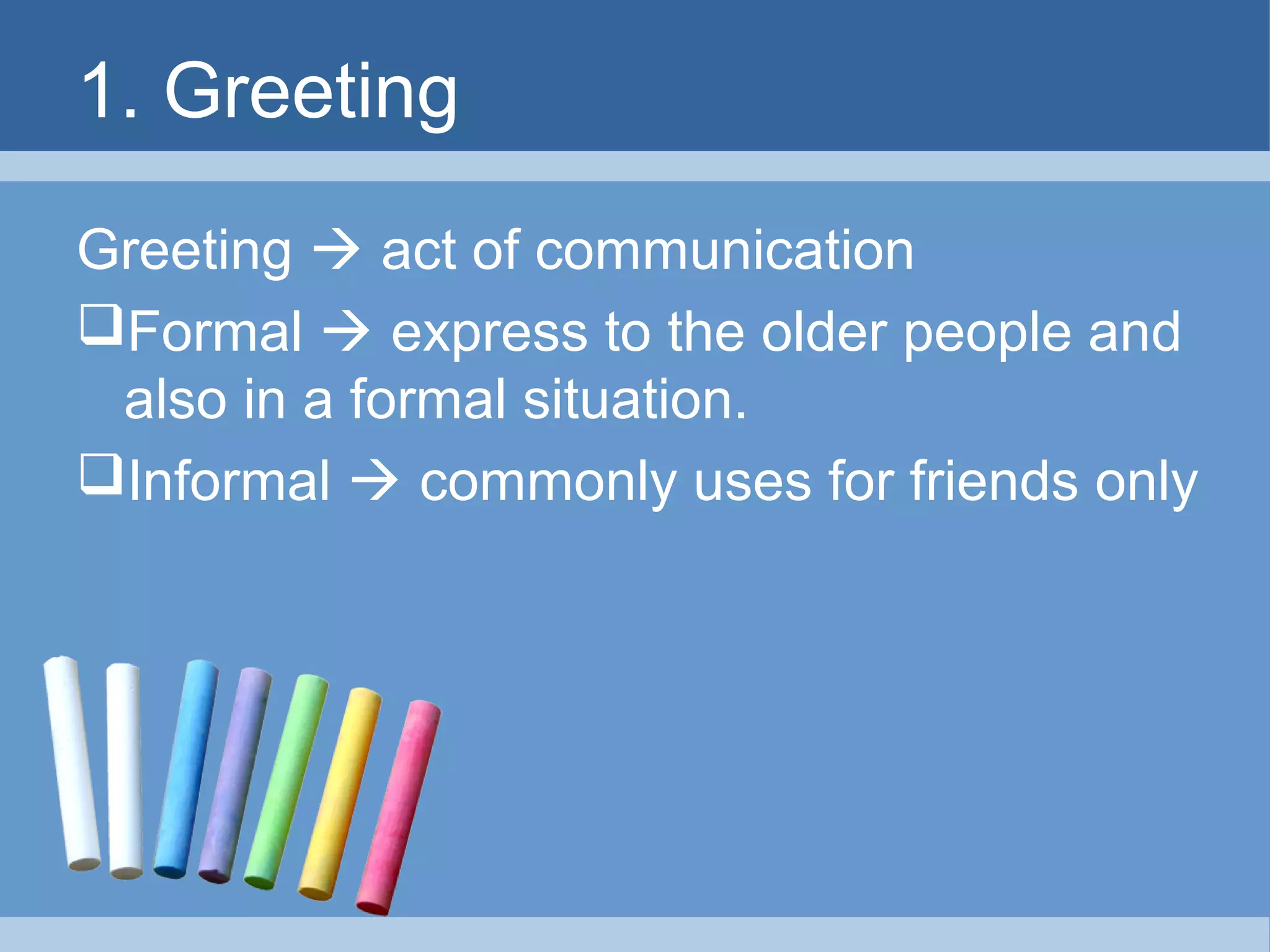 This document provides examples of greetings and introductions in both formal and informal situations. For greetings, it gives common phrases used for formal greetings like "Good morning" as well as informal greetings like "Hi" or "What's up?". It also provides typical responses for each. The document includes two examples dialogs using these greetings. For introductions, it outlines information someone might share like their name, birthplace, age, student status, and major. The goal is to introduce oneself in a clear but natural way.