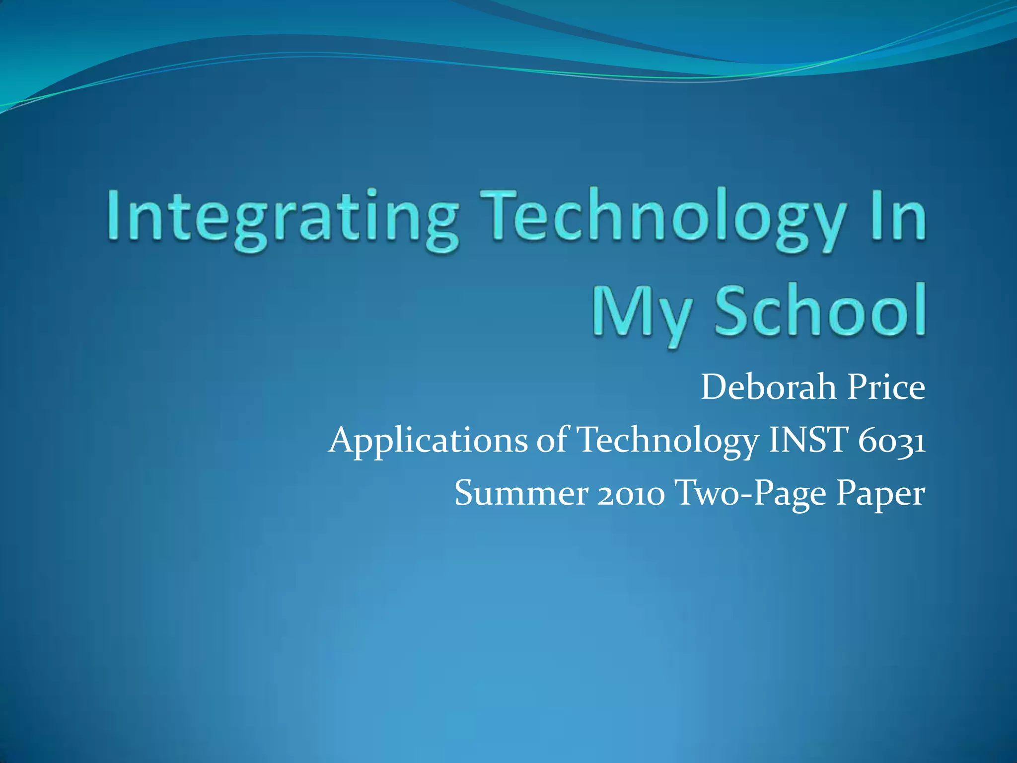 The document outlines a plan for integrating technology into a school by having the principal create a comfortable environment and commit to incorporating technology, the media specialist work with staff to teach technology skills and encourage reluctant learners, and using technology for assessments, drills, tutorials, and games to improve teaching and learning through a shared vision of student engagement, teacher competency, and support.