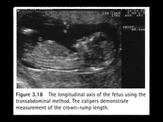 Basic ultrasound in O&G can be used to confirm and date pregnancies, screen for abnormalities, and evaluate problems in early pregnancy. Key applications include using scans from 4-5 weeks to detect a gestational sac and fetal pole, measuring the crown-rump length from 6-12 weeks to date the pregnancy, screening for issues like ectopic pregnancy or miscarriage, and assessing fetal growth and anatomy later in pregnancy. Ultrasound is also used for gynecological conditions like fibroids, cysts and infertility workups.