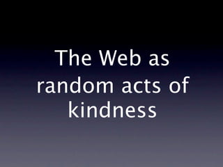 The document discusses the positive power of random acts of kindness on the internet. It provides examples of how people have used the internet to share knowledge through Wikipedia, connect through social media, and spread kindness through sharing pictures. The overall message is that the internet allows for spreading kindness when used to connect people and share information freely for positive purposes.