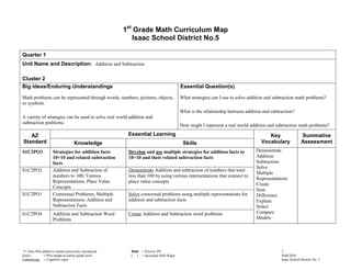 This document outlines the 1st grade math curriculum map for the Isaac School District. In quarter 1, students will learn about number sense including representing and comparing whole numbers up to 100. They will also learn addition and subtraction strategies and how to represent word problems using various methods. In quarter 2, students will study patterns, learning about different types of patterns that occur in real life and how patterns can be used to solve problems.