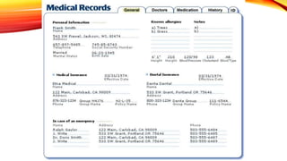 The document discusses medical records, including their purpose and components. Medical records serve both clinical and non-clinical purposes, providing a record of a patient's medical history and care. They support continuity of care and include information such as diagnoses, treatments, test results, and notes from healthcare professionals. Key components of medical records include personal identification information, diagnostic information, physical exam findings, and documentation of treatment plans and outcomes. Accuracy, completeness, timeliness and confidentiality are important principles for proper medical record documentation.
