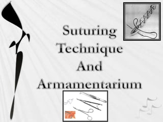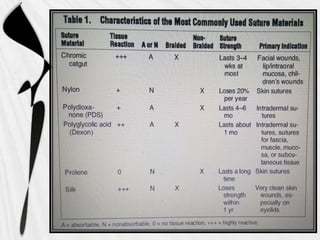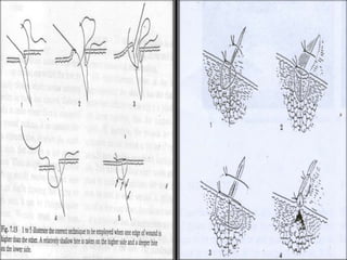 This document provides information on sutures and suturing techniques used in oral and maxillofacial surgery. It discusses the history of sutures, various suture materials including absorbable and non-absorbable options, suture sizes, needles, knots, and different suturing techniques. The principles of suturing and indications for different suture techniques are also outlined.
