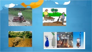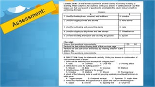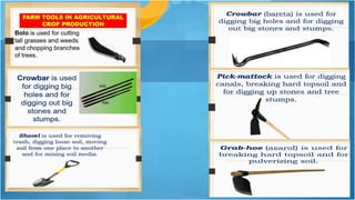This document outlines a lesson plan on farm equipment, tools, and materials. The objectives are to identify different types, understand their importance, and demonstrate their use. Students are divided into groups to complete activities like drawing and labeling tools, listing tools by category, or performing demonstrations. The lesson includes discussions of hand tools, farm implements, and powered equipment. As an assignment, students must create a scrapbook with pictures and descriptions of tools for land preparation, cultivation, plant propagation, and harvesting. The lesson aims to teach students about various farm equipment, tools, and materials.