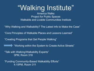 The document discusses strategies for promoting walkable and livable communities, featuring insights from various experts on partnership-building and grassroots advocacy. It highlights the importance of persistence, education, and collaboration with transportation agencies to effect policy changes for enhancing walkability. Additionally, it provides examples from past successful initiatives and outlines common myths about traffic planning.