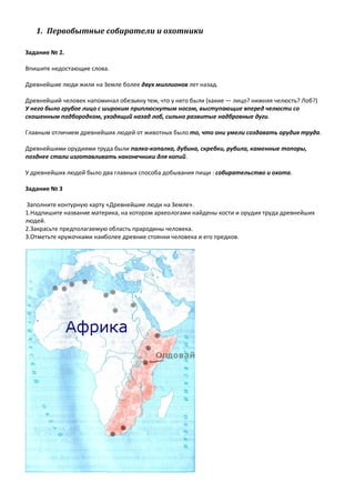 Документ представляет собой решебник к рабочей тетради по всеобщей истории для 5 класса, охватывающий темы первобытной эпохи, включая занятия древних людей, такие как охота и собирательство. Включает задания по заполнению карт, ответам на вопросы и кроссвордам, а также описывает важные исторические моменты, такие как умение создавать орудия труда и образ жизни первобытных общин. В документе также обсуждаются культурные аспекты, верования и прогресс в жизни людей с появлением земледелия и скотоводства.