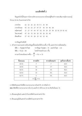 ขอมูลตอไปนี้เปนผลการวิเคราะหความกระวนกระวายใจของผูที่จะทําการสอบสัมภาษณความรอบรู จํานวน 50 คน จําแนกตามสาขาวิชา ภาษาไทย 62 52 32 22 43 41 25 44 ภาษาอังกฤษ 43 53 63 27 47 37 45 54 46 64 คณิตศาสตร 37 27 47 49 47 65 54 39 29 49 35 45 59 45 42 วิทยาศาสตร 47 55 70 58 30 50 56 50 40 สังคมศึกษา 57 43 41 28 35 60 32 42 จากขอมูลขางตนให 1. สรางตารางแจกแจงความถี่ของขอมูลทั้งหมดโดยใหจํานวนชั้น 5 ชั้น และหาคาความถี่สะสมดวย พิสัย = คาสูงสุด-คาต่ําสุด จากขอมูล คาสูงสุด = 70 และคาต่ําสุด = 22 พิสัย = 70-22 = 48 โจทยกําหนดจํานวน 5 ชั้น 48 ความกวางของอันตรภาคชั้น = = 9.6 ≈ 10 5 ชั้นคะแนน ความถี่(f) ความถี่สะสม(F) จุดกึ่งกลางชั้น(X) 22-31 7 7 26.5 32-41 10 17 36.5 42-51 18 35 46.5 52-61 10 45 56.5 62-71 5 50 66.5 N ≡ ∑ f ≡ 50 2. มีนิสิตรอยละเทาใดที่มีความกระวนกระวายใจเทากับ 50 หรือต่ํากวา ตอบ นิสิตที่มีความกระวนกระวายใจ 50 และต่ํากวา มีจํานวน 35 คน คิดเปนรอยละ 70 3. เขียนแผนภูมิแทง แสดงวาจํานวนนิสิตจําแนกตามสาขาวิชา 4. เขียนแผนภูมิเสนแสดงจํานวนนิสิตจําแนกตามสาขาวิชา