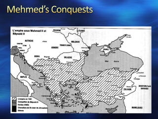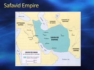 The document summarizes three major Muslim empires that arose after the period of Islamic expansion in the 1100s. The Ottoman Empire originated from Turkish warriors in Anatolia and the Balkans and expanded through conquering the Byzantine Empire and lands in Europe, Africa, and Asia under rulers like Mehmed II and Suleiman I. The Safavid Empire emerged in Persia under rulers like Ismail I and Abbas I and blended Persian and Muslim cultural traditions. The Mughal Empire was established in India by Babur and saw cultural blending under Akbar's policies of religious tolerance, leading to architectural works like the Taj Mahal.