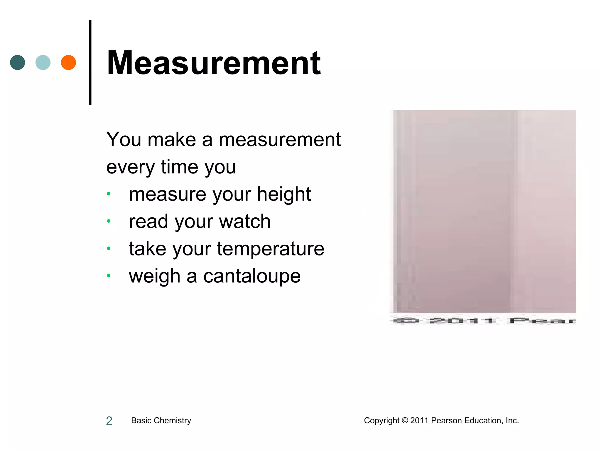 The document discusses units of measurement used in chemistry. It introduces common units like meters, liters, grams, seconds that are used to measure length, volume, mass and time. These units make up the International System of Units (SI) and metric system which are decimal systems used widely in science. Examples are given of measuring tools and conversions between units like inches to centimeters. Key types of measurements covered are length, volume, mass, temperature and time.