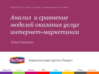 Документ рассматривает интернет-маркетинг как часть общего процесса маркетинга, акцентируя внимание на его инструментах и актуальных трендах. Основное внимание уделяется росту бюджета на интернет-рекламу, изменению фокуса с привлечения клиентов на конверсию и взаимодействие с клиентами. Также обсуждается кризис сайтостроительства и недостаточная стандартизация услуг разных агентств.