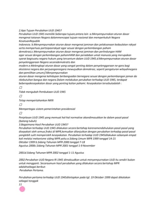 Perubahan UUD 1945 bertujuan untuk menyempurnakan aturan dasar negara, memperkuat kedaulatan rakyat, serta menjamin perlindungan HAM sesuai dengan perkembangan zaman. Perubahan dilakukan secara bertahap melalui sidang MPR dari 1999 hingga 2002, dengan empat kali amandemen yang melibatkan banyak pasal. Sebelum kembali ke UUD 1945 pada 1959, Indonesia mengalami perubahan konstitusi dari negara serikat ke kesatuan dan berlaku UUD sementara 1950.