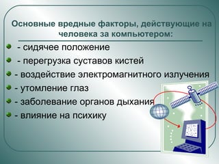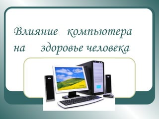 Документ рассматривает негативное влияние компьютеров на здоровье человека, включая сидячий образ жизни, перегрузку суставов, электромагнитное излучение и утомление глаз. Особенно подвержены риску дети, у которых длительное взаимодействие с компьютером может вызвать психические и интеллектуальные нарушения. В качестве альтернативы рекомендуется заниматься спортом для улучшения здоровья.