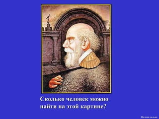 Документ описывает оптические иллюзии и различные упражнения для зрительного восприятия. Он предлагает пользователю взаимодействовать с изображениями, чтобы увидеть скрытые детали и эффекты, создаваемые концентрацией взгляда. В завершение даются инструкции для выполнения забавного визуального трюка с рукой.