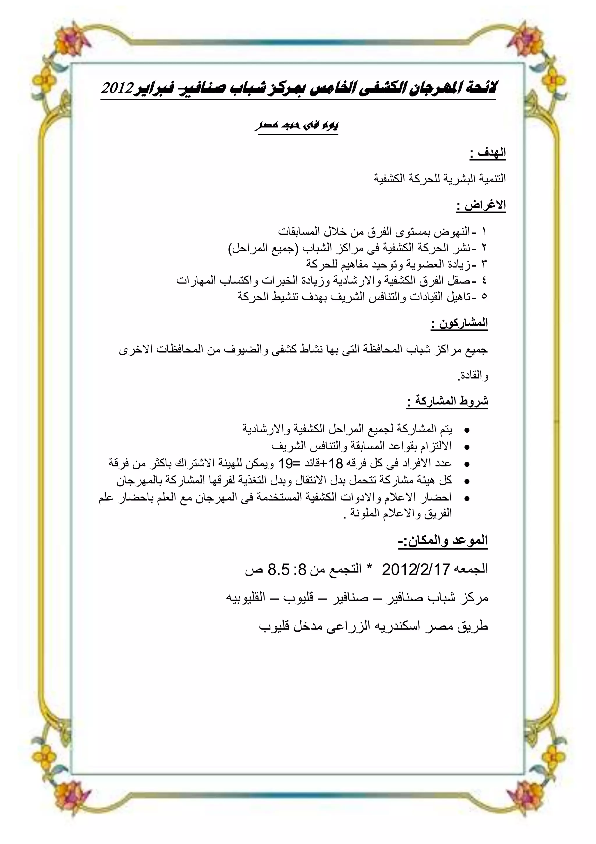 تنظم مراكز شباب محافظة قليوب المهرجان الكشفي الخامس بهدف تعزيز الحركة الكشفية وتنمية المهارات القيادية بين المشاركين. يشمل المهرجان مسابقات في مجالات متعددة مثل الدين والثقافة والرياضة، مع شروط مشاركة واضحة وتقديم جوائز للفرق المتميزة. يتوجب على المشاركين الالتزام بالقواعد والشروط المحددة، بما في ذلك تقديم الأعمال الفنية والأدوات المستخدمة.