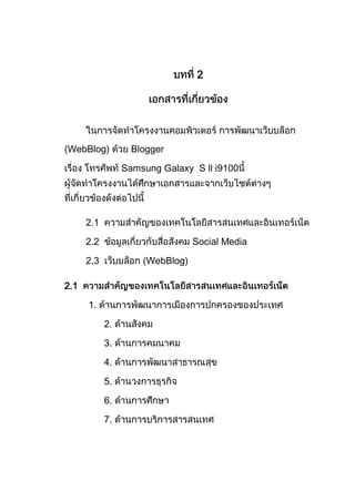 The document discusses blogging and social media. It covers the history of blogs beginning in 1997 and their evolution into various types including personal blogs, news blogs, collaborative blogs, and more. It also discusses key aspects of social media like social networking sites, media sharing platforms, social bookmarking, and online forums. Examples of popular blogging platforms and social media sites are provided.