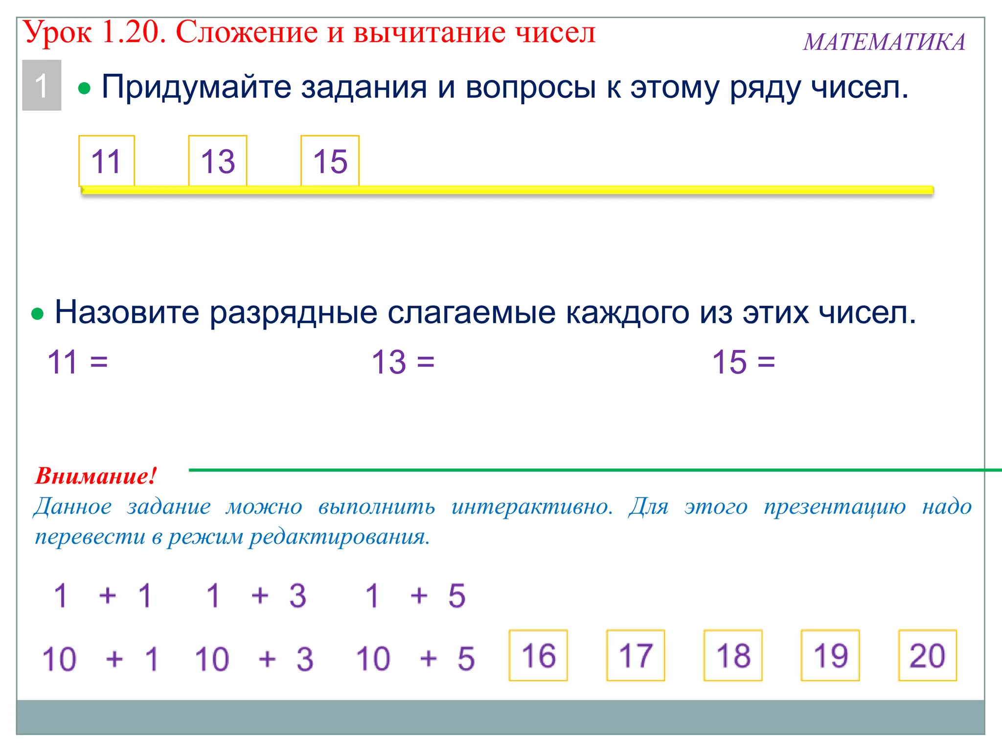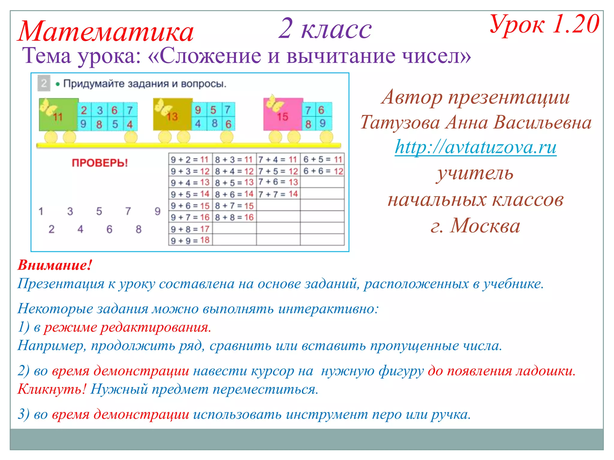 Документ описывает интерактивные задания по математике для второго класса, фокусируясь на сложении и вычитании. Приводятся примеры заданий и методов выполнения, включая использование презентации в режиме редактирования. Также обсуждаются различные математические свойства и правила, с которыми дети могут познакомиться в процессе обучения.