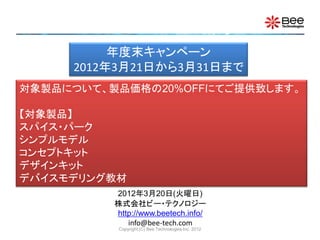 2012年3月21日から3月31日まで 対象製品について、製品価格の20%OFFにてご提供致します。 【対象製品】 スパイス・パーク シンプルモデル コンセプトキット デザインキット デバイスモデリング教材 2012年3月20日(火曜日) 株式会社ビー・テクノロジー http://www.beetech.info/ info@bee-tech.com Copyright (C) Bee Technologies Inc. 2012