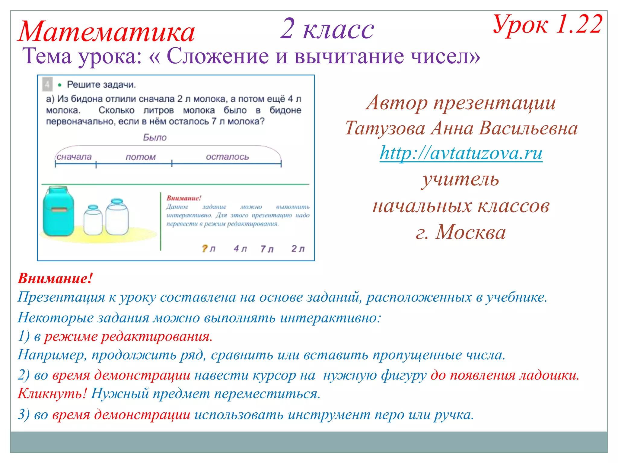 Документ содержит задания по математике для второго класса, посвященные сложению и вычитанию чисел, которые можно выполнять интерактивно. Урок 1.22 включает различные задания, такие как сравнение чисел, решение уравнений и логические задачи. Учитель Татузова Анна Васильевна предлагает методические рекомендации по выполнению упражнений с использованием учебников и презентаций.