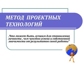 Метод проектных технологий направлен на создание условий для успешного и значимого обучения школьников, учитывая их интересы и потребности. Проектное обучение способствует развитию навыков самостоятельного поиска, командной работы и творческого решения проблем, что формирует активные и конкурентоспособные личности. В современном образовании данный подход рассматривается как эффективная альтернатива традиционному обучению, позволяющая интегрировать теорию и практику.
