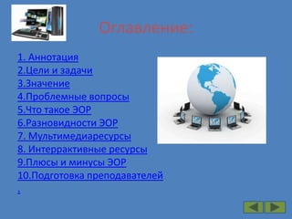 Документ представляет собой пособие, посвященное электронным образовательным ресурсам (ЭОР) в педагогике, описывающее их виды, преимущества и недостатки. Основная цель состоит в ознакомлении педагогов и студентов с возможностями ЭОР и их применением в обучении. Раскрываются проблемные вопросы, связанные с использованием ЭОР в учебном процессе и необходимостью подготовки преподавателей к работе с ними.