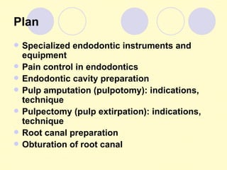 - Pulp amputation (pulpotomy) which involves removing part of the pulp, the indications, and technique.