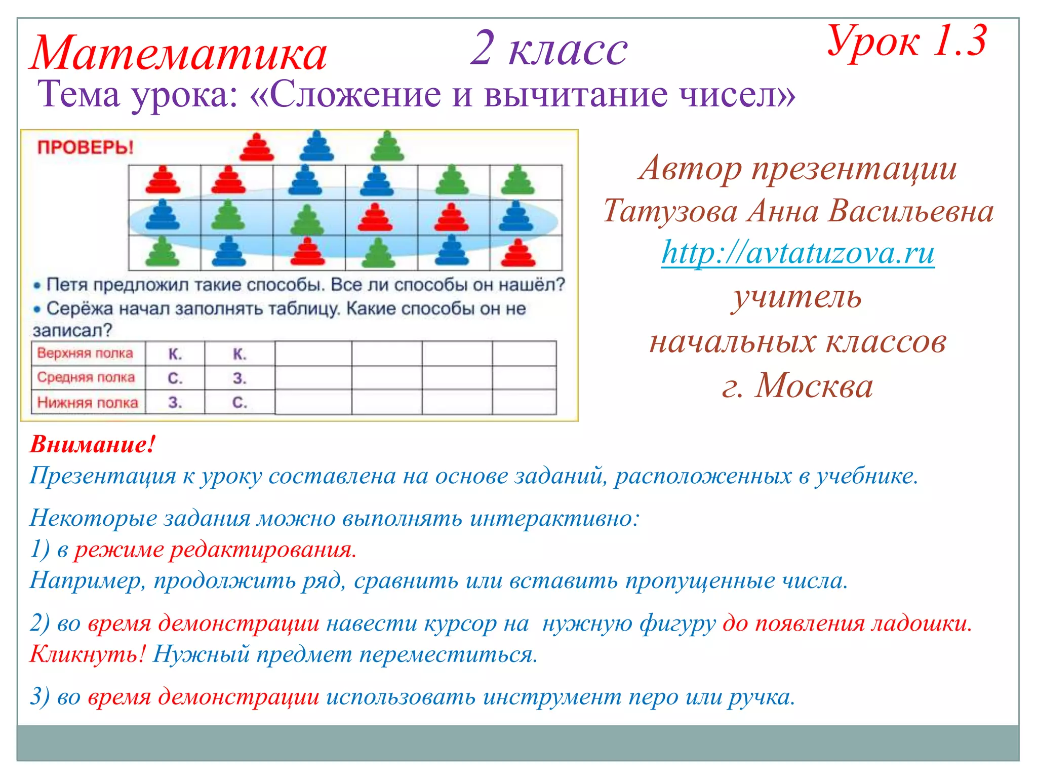 Документ содержит задания по математике для 2 класса, связанные с темой сложения и вычитания чисел. Упражнения включают интерактивные элементы, такие как редактирование презентации и использование различных инструментов. Ученикам предлагается называть числа в порядке возрастания, находить пары слагаемых и решать уравнения.