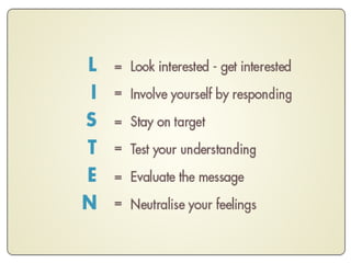 This document discusses the importance of listening skills. It begins by explaining that listening is the most used communication skill, taking up 45% of our time, but it is the least taught. It then identifies why listening skills are important for employability. The document outlines common barriers to effective listening and bad listening habits. It describes different types of listening including active listening and reflective listening. It provides tips for effective listening such as avoiding distractions, being open-minded, and paraphrasing. Finally, it emphasizes that listening requires mental effort and involves more than just hearing.