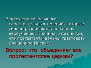 Документ описывает различные течения протестантизма, включая лютеранство, кальвинизм, англиканство, баптизм, адвентизм, пятидесятничество и методизм. Все эти направления объединяет вера в Иисуса Христа, авторитет Библии, два таинства (крещение и причащение) и активная миссионерская деятельность. Протестантские церкви продолжают набирать популярность в современном мире и в России.