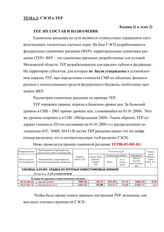 Документ рассматривает территориальные и федеральные единичные расценки (тер и фер) для сметного учета затрат на строительство. В нем описываются принципы формирования тер, включая распределение затрат по элементам, а также используемые данные для расчета стоимости труда и материальных затрат. Также упоминаются изменения в расчетах в соответствии с новыми редакциями стандартов.