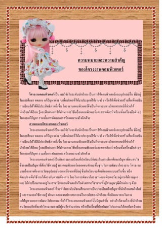 ของโครงงานคอมพิวเตอร์ โครงงานคอมพิวเตอร์ เป็ นงานวิจยในระดับนักเรี ยน เป็ นการใช้คอมพิวเตอร์ และอุปกรณ์อื่น ที่มีอยู่ ั ในการศึกษา ทดลอง แก้ปัญหาต่าง ๆ เพื่อนาผลที่ได้มาประยุกต์ใช้งานจริ ง หรื อใช้เพื่อช่วยสร้างสื่ อเพื่อเสริ ม การเรี ยนให้ได้ดีมีประสิ ทธิ ภาพยิงขึ้น โครงงานคอมพิวเตอร์ จึงเป็ นกิจกรรมทางวิทยาศาสตร์ ที่ช่วยให้ ่ นักเรี ยนได้เรี ยน รู ้และฝึ กฝนการใช้ทกษะการใช้เครื่ องคอมพิวเตอร์ และซอฟต์แวร์ พร้อมทั้งเครื่ องมือต่าง ๆ ั ในการแก้ปัญหา รวมทั้งการพัฒนาการสร้างผลงานจริ งอีกด้วย ความหมายโครงงานคอมพิวเตอร์ โครงงานคอมพิวเตอร์ เป็ นงานวิจยในระดับนักเรี ยน เป็ นการใช้คอมพิวเตอร์ และอุปกรณ์อื่น ที่มีอยู่ ั ในการศึกษา ทดลอง แก้ปัญหาต่าง ๆ เพื่อนาผลที่ได้มาประยุกต์ใช้งานจริ ง หรื อใช้เพื่อช่วยสร้างสื่ อเพื่อเสริ ม การเรี ยนให้ได้ดีมีประสิ ทธิ ภาพยิงขึ้น โครงงานคอมพิวเตอร์ จึงเป็ นกิจกรรมทางวิทยาศาสตร์ ที่ช่วยให้ ่ นักเรี ยนได้เรี ยน รู ้และฝึ กฝนการใช้ทกษะการใช้เครื่ องคอมพิวเตอร์ และซอฟต์แวร์ พร้อมทั้งเครื่ องมือต่าง ๆ ั ในการแก้ปัญหา รวมทั้งการพัฒนาการสร้างผลงานจริ งอีกด้วย โครงงานคอมพิวเตอร์ เป็ นกิจกรรมการเรี ยนที่นกเรี ยนมีอิสระในการเลือกศึกษาปั ญหาที่ตนสนใจ ั ซึ่ งอาจเป็ นปั ญหาที่ตองใช้ความรู ้ ทางคอมพิวเตอร์ ตลอดจนทักษะพื้นฐานในการพัฒนาโครงงาน โครงงาน ้ บางเรื่ องอาจต้องการวัสดุอุปกรณ์นอกเหนือจากที่มีอยู่ ซึ่ งนักเรี ยนจะต้องคิดออกแบบสร้างขึ้น หรื อ ่ ดัดแปลงเพื่อใช้งานได้ตรงกับความต้องการ โดยในการพัฒนาโครงงานคอมพิวเตอร์ จะอยูภายใต้การดูแล และให้คาปรึ กษาของครู ใน สาขาวิชาคอมพิวเตอร์ หรื อต่างสาขาวิชารวมทั้งผูทรงคุณวุฒิดานต่าง ๆ ด้วย ้ ้ โครงงานคอมพิวเตอร์ ที่จะทาในระดับมัธยมศึกษาควรเป็ นประเด็นหรื อปั ญหาที่นกเรี ยนสนใจใคร่ ั รู้ และสามารถใช้ความรู้ ทักษะ ตลอดจนประสบการณ์ในระดับของนักเรี ยน เพื่อคิดแนวทางในการ แก้ปัญหาและการพัฒนาโปรแกรม เพื่อให้โครงงานคอมพิวเตอร์ น้ นมีคุณค่ายิง อย่างไรก็ตามเรื่ องที่นกเรี ยน ั ่ ั สนใจและคิดที่จะทาโครงงานอาจมีผสนใจทามาก่อน หรื อเป็ นเรื่ องที่นกพัฒนาโปรแกรมได้เคยค้นคว้าและ ู้ ั