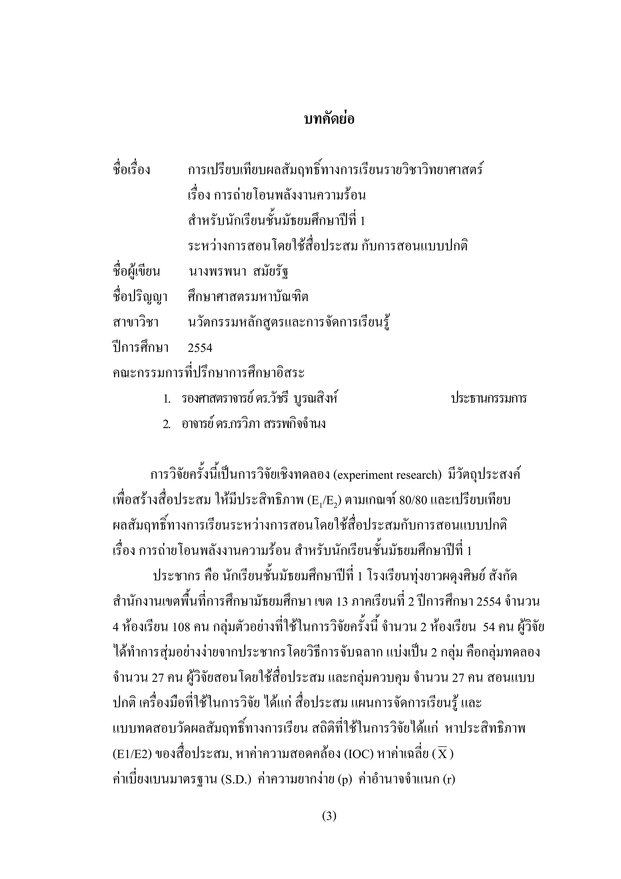 การเปรียบเทียบผลสัมฤทธิ์ทางการเรียนรายวิชาวิทยาศาสตร เรื่อง การถายโอนพลังงานความรอน สําหรับนักเรียนชั้นมัธยมศึกษาปที่ 1 ระหวางการสอนโดยใชสื่อประสม กับการสอนแบบปกติ ชื่อผูเขียน นางพรพนา สมัยรัฐ ชื่อปริญญา ศึกษาศาสตรมหาบัณฑิต สาขาวิชา นวัตกรรมหลักสูตรและการจัดการเรียนรู ปการศึกษา 2554 คณะกรรมการที่ปรึกษาการศึกษาอิสระ 1. รองศาสตราจารย ดร.วัชรี บูรณสิงห ประธานกรรมการ 2. อาจารย ดร.กรวิภา สรรพกิจจํานง การวิจัยครั้งนี้เปนการวิจัยเชิงทดลอง (experiment research) มีวัตถุประสงค เพื่อสรางสื่อประสม ใหมประสิทธิภาพ (E1/E2) ตามเกณฑ 80/80 และเปรียบเทียบ ี ผลสัมฤทธิ์ทางการเรียนระหวางการสอนโดยใชสอประสมกับการสอนแบบปกติ ื่ เรื่อง การถายโอนพลังงานความรอน สําหรับนักเรียนชั้นมัธยมศึกษาปที่ 1 ประชากร คือ นักเรียนชันมัธยมศึกษาปที่ 1 โรงเรียนทุงยาวผดุงศิษย สังกัด ้ สํานักงานเขตพื้นที่การศึกษามัธยมศึกษา เขต 13 ภาคเรียนที่ 2 ปการศึกษา 2554 จํานวน 4 หองเรียน 108 คน กลุมตัวอยางที่ใชในการวิจัยครั้งนี้ จํานวน 2 หองเรียน 54 คน ผูวิจัย ไดทําการสุมอยางงายจากประชากรโดยวิธีการจับฉลาก แบงเปน 2 กลุม คือกลุมทดลอง จํานวน 27 คน ผูวิจัยสอนโดยใชสื่อประสม และกลุมควบคุม จํานวน 27 คน สอนแบบ ปกติ เครื่องมือที่ใชในการวิจัย ไดแก สื่อประสม แผนการจัดการเรียนรู และ แบบทดสอบวัดผลสัมฤทธิ์ทางการเรียน สถิติที่ใชในการวิจัยไดแก หาประสิทธิภาพ (E1/E2) ของสื่อประสม, หาคาความสอดคลอง (IOC) หาคาเฉลี่ย ( X ) คาเบี่ยงเบนมาตรฐาน (S.D.) คาความยากงาย (p) คาอํานาจจําแนก (r) (3)