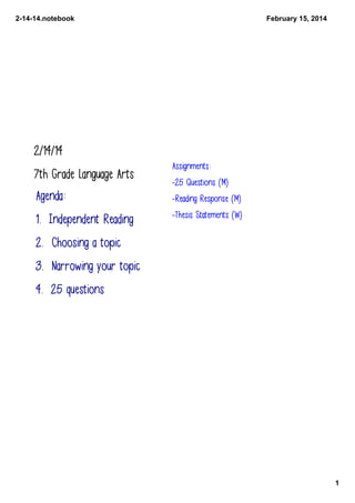 The document contains notes from a 7th grade language arts class. It discusses selecting topics that are neither too general nor too limited, identifies example topics at the appropriate level of specificity, and lists potential controversial topics students could write about. Assignments included a reading response, thesis statements, and developing 25 questions on their topic.