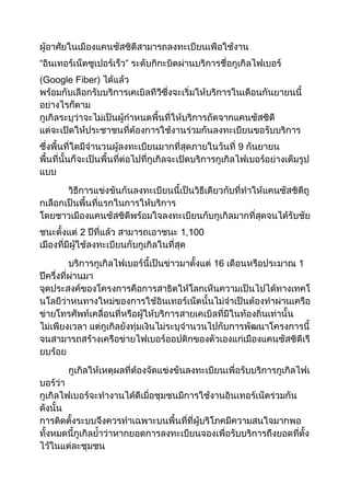 Google announced plans to launch an ultra-fast fiber optic internet service in several cities across the U.S., with speeds up to 100 times faster than average broadband and TV services delivered over the same network. The first city to receive Google Fiber is Kansas City, where construction began in 2012 and internet speeds up to 1 gigabit per second are now available to over 20,000 homes, with TV services to follow. Google aims to expand the service to additional cities depending on the success in Kansas City.