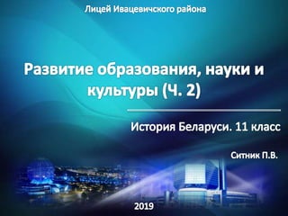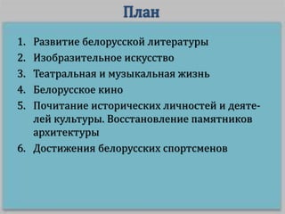 Документ описывает развитие белорусской культуры, включая литературу, изобразительное искусство, театр, музыку и кино. Он акцентирует внимание на ключевых темах белорусской идентичности и национальной идее, а также на влиянии исторических событий, как Чернобыльская катастрофа, на культурное творчество. Также рассматриваются достижения белорусских художников и литераторов, а также памятники, посвящённые историческим личностям, что подчеркивает значимость сохранения культурного наследия Беларуси.