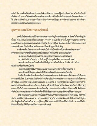 ย นมี ค วามรู้ ความช านาญ และมี ความมั่ น ใจในการน าระบบคอมพิ ว เตอร์ ไ ปใช้ ใ นการ แก้ ปั ญ หา ประดิ ษ ฐ์ คิด ค้ น หรือ ค้ น คว้ า หาความรู้ ต่ า ง ๆ ด้ ว ยตนเองและยั ง มี คุณ ค่ า อื่ น ๆ อี ก ดังต่อไปนี้ 1. สร้างความสานึกและความรับผิดชอบในการศึกษาและพัฒนาระบบด้วยตนเอง 2. เปิดโอกาสให้นักเรียนได้พัฒนาและแสดงความสามารถตามศักยภาพของตนเอง 3. เปิดโอกาสให้นักเรียนได้ศึกษา ค้นคว้า และเรียนรู้ในเรื่องที่นักเรียนสนใจได้ลึกซึ้งกว่า การเรียนในห้องตามปกติ 4. ส่งเสริมและพัฒนากระบวนการคิด การแก้ปัญหา การตัดสินใจ รวมทั้งการสื่อสาร ระหว่างกัน 5. กระตุ้นให้นักเรียนมีความสนใจในการเรียนวิชาสาขาคอมพิวเตอร์ และมีความสนใจที่ จะประกอบอาชีพทางด้านนี้ 6. ส่งเสริมให้นักเรียนได้ใช้เวลาอย่างเป็นประโยชน์ในทางสร้างสรรค์ 7. สร้างความสัมพันธ์ระหว่างนักเรียนกับครูและชุมชน รวมทั้งส่งเสริมให้ชุมชนสนใจ คอมพิว เตอร์และเทคโนโลยีที่เกี่ยวข้องมากขึ้น 8. เป็นการบูรณาการเอาความรู้จากวิชาต่าง ๆ ที่ได้รับมาจัดทาผสมผสานกับโปรแกรม คอมพิวเตอร์เป็นโครงงานเพื่อนาเสนอต่อชุมชน การจัดทาโครงงานคอมพิวเตอร์นั้น นักเรียนควรมีความรู้พื้นฐานเกี่ยวกับการทางานของ เครื่องคอมพิวเตอร์ เหตุผลที่ใช้ในการแก้ปัญหา กระบวนการแก้ปัญหา หลักการเขียนโปรแกรม เบื้องต้น และการแทนข้อมูลในคอมพิวเตอร์ ก่อนที่จะเริ่มทาโครงงาน และใช้ความรู้ดังกล่าวเป็น พื้นฐานในการสร้างความรู้ใหม่ในโครงงานคอมพิวเตอร์ โดยในการทาโครงงานนักเรียนอาจจะมี โอกาสได้ ท าความรู้ จั ก กั บ ความรู้ ใ หม่ เ พิ่ ม เติ ม อี ก ด้ ว ย เช่ น ปั ญ ญาประดิ ษ ฐ์ (Artificial Intelligence) ฐานข้อมูล (Database) และการสืบค้นข้อมูล (Information Retrieval) เป็นต้น ซึ่งจะขึ้นอยู่กับหัวข้อที่นักเรียนเลือกทาโครงงาน แหล่งที่มา : http://kruoong.blogspot.com/2011/05/blog-post.html