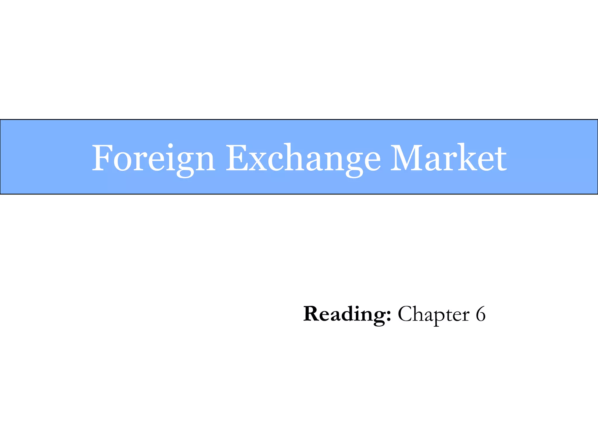 The document provides an overview of the foreign exchange market, including its key participants and characteristics. It describes the functions and size of the FX market, with an average daily turnover of over $2 trillion. The key participants are banks and dealers that act as market makers by buying and selling currencies. Spot transactions settle in 2 days while forwards lock in an exchange rate for future delivery. The document outlines different currency quotes and rates, including bid-ask spreads, direct vs indirect quotes, and how forward rates are expressed.