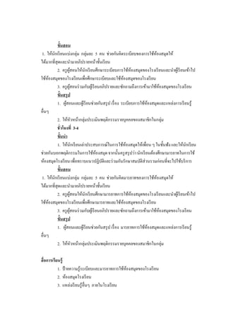 ยนแบ่งกลุ่ม กลุ่มละ 5 คน ช่วยกันคิดระเบียบของการใช้หองสมุดให้ ั ้ ได้มากที่สุดและนามาอภิปรายหน้าชั้นเรี ยน 2. ครู ผสอนให้นกเรี ยนศึกษาระเบียบการใช้หองสมุดของโรงเรี ยนและนาผูเ้ รี ยนเข้าไป ู้ ั ้ ใช้หองสมุดของโรงเรี ยนเพื่อศึกษาระเบียบและใช้หองสมุดของโรงเรี ยน ้ ้ 3. ครู ผสอนร่ วมกับผูเ้ รี ยนอภิปรายและซักถามถึงการเข้ามาใช้หองสมุดของโรงเรี ยน ู้ ้ ขั้นสรุป 1. ผูสอนและผูเ้ รี ยนช่วยกันสรุ ป เรื่ อง ระเบียบการใช้หองสมุดและแหล่งการเรี ยนรู้ ้ ้ อื่นๆ 2. ให้หวหน้ากลุ่มประเมินพฤติกรรมรายบุคคลของสมาชิกในกลุ่ม ั ชั่วโมงที่ 3-4 ขั้นนา 1. ให้นกเรี ยนเล่าประสบการณ์ในการใช้หองสมุดให้เพื่อน ๆ ในชั้นฟัง และให้นกเรี ยน ั ้ ั ช่วยกันบอกพฤติกรรมในการใช้หองสมุด จากนั้นครู สรุ ปว่า นักเรี ยนต้องศึกษามารยาทในการใช้ ้ ห้องสมุดโรงเรี ยน เพื่อทราบแนวปฏิบติและร่ วมกันรักษาสมบัติส่วนรวมก่อนที่จะไปใช้บริ การ ั ขั้นสอน 1. ให้นกเรี ยนแบ่งกลุ่ม กลุ่มละ 5 คน ช่วยกันคิดมารยาทของการใช้หองสมุดให้ ั ้ ได้มากที่สุดและนามาอภิปรายหน้าชั้นเรี ยน 2. ครู ผสอนให้นกเรี ยนศึกษามารยาทการใช้หองสมุดของโรงเรี ยนและนาผูเ้ รี ยนเข้าไป ู้ ั ้ ใช้หองสมุดของโรงเรี ยนเพื่อศึกษามารยาทและใช้หองสมุดของโรงเรี ยน ้ ้ 3. ครู ผสอนร่ วมกับผูเ้ รี ยนอภิปรายและซักถามถึงการเข้ามาใช้หองสมุดของโรงเรี ยน ู้ ้ ขั้นสรุป 1. ผูสอนและผูเ้ รี ยนช่วยกันสรุ ป เรื่ อง มารยาทการใช้หองสมุดและแหล่งการเรี ยนรู้ ้ ้ อื่นๆ 2. ให้หวหน้ากลุ่มประเมินพฤติกรรมรายบุคคลของสมาชิกในกลุ่ม ั สื่อการเรียนรู้ 1. ป้ ายความรู้ระเบียบและมารยาทการใช้หองสมุดของโรงเรี ยน ้ 2. ห้องสมุดโรงเรี ยน 3. แหล่งเรี ยนรู้อื่นๆ ภายในโรงเรี ยน