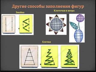 Документ описывает методику создания ниткописи и изонити, а также материалы и инструменты, необходимые для выполнения данных техник. В процессе работы используются различные цветные нити и плотные фоны, что позволяет детям развивать творческие навыки, создавая изображения с помощью натягивания нитей. Также упоминается исторический аспект возникновения изонити и ее современные применения в декоре и рукоделии.