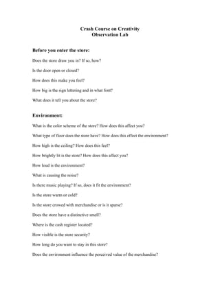 The store environment is brightly lit with red and white colors and a wooden floor. It is cold inside with many products and a distinctive mint smell. The music is very loud which causes noise. Salespeople do not initiate contact and do not have uniforms, appearing mismatched to the store's teen image. Products are arranged by price with impulse items by the register and most/least expensive items in back/front. Customers, mostly teens in groups, stay for about 15 minutes on a mission to find the best inexpensive item, with 30% purchasing.