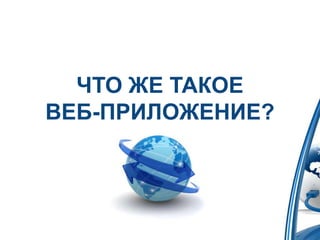 Документ представляет лекцию о веб-приложениях, объясняя, что это такое и перечисляя их преимущества и недостатки. Приводятся примеры популярных веб-приложений, таких как YouTube и Google Drive, а также описывается процесс создания Google аккаунта и использования различных сервисов. Лекция завершается домашним заданием, связанным с созданием документа в Google Drive.