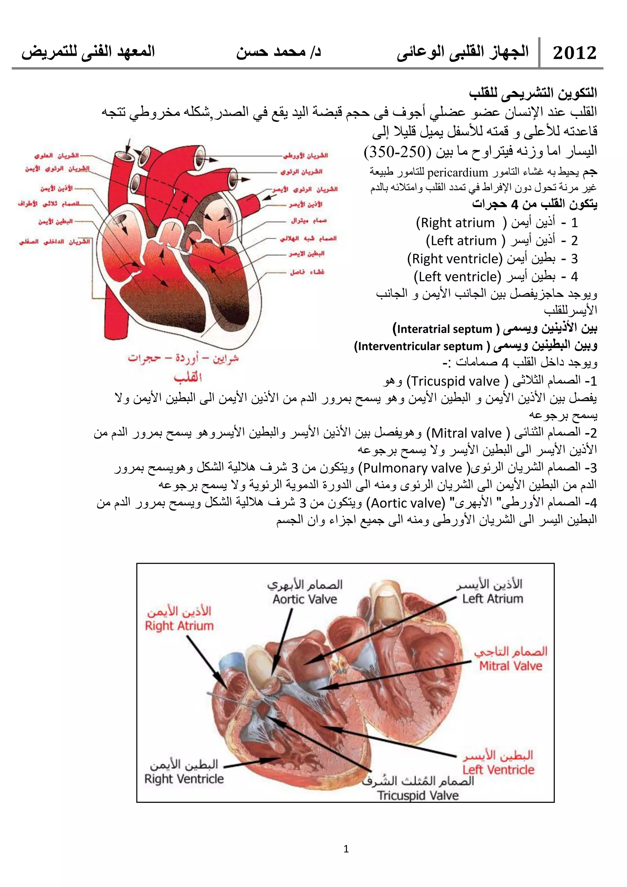 تتناول الوثيقة تشريح القلب ووظائفه، حيث يتكون القلب من أربع حجرات وأربعة صمامات، وتدفق الدم عبر الدورة الدموية. كما تتطرق إلى الشرايين التاجية وكيفية حدوث تصلب الشرايين وأمراضها، وكذلك الذبحة الصدرية وأسبابها. تقدم الوثيقة معلومات دقيقة حول تدفق الدم، وآلية عمل القلب، والعوامل التي تؤثر في صحة القلب والأوعية الدموية.