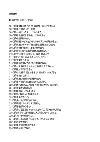 添付資料 【チェックリスト】(フルバージョン) 001□「乗り換え待ちの 30 分の間、何もできない」 002□「飛行機内って、退屈」 003□「一緒にいる人と、けんかする」 004□「観光客だと思われ、だまされる」 005□「喫煙所がない」 006□「韓国の地下鉄のチケットの買い方がわからん」 007□「現地のおみやげ物の適性価格が知りたい」 008□「荷物を預けられる場所がない」 009□「持って行った服が現地とあわない。」 010□「ずっと立ちっぱなしで、長時間過ごす」 011□「ヒッチハイクしてみたいけど、こわい」 012□「充電きれそう」 013□「荷物が多くて歩くのが苦痛になる」 014□「一人旅だとなかなか飲食店に入りづらい」 015□「服が汗くさくなる」 016□「もっと絵日記とか書きたいけれど…かさばる」 017□「名物って高い」 018□「現地の病院の情報がない」 019□「食べ物が口に合わないものばかり」 020□「地元民オススメの食べ物・おみやげ、知りたい」 021□「言葉が通じない」 022□「鍵をなくしてしまった」 023□「知らない人と相席になる」 024□「子供がさわぐ」 025□「食べ物が口に合わない」 026□「時間にルーズな人が多い」 027□「習慣がわからない」 028□「歩ける距離じゃないのに歩いて、足の皮がむけた」 029□「まちがって違う部屋に入りそうになってしまった」 030□「ネットがつながらない」 031□「思い通りの旅行にならず、けんかになった」 032□「治安が悪い」 033□「衛生面に問題がある」 034□「店があいてない」