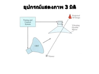 Input devices include keyboards, mice, trackballs, light pens, touchscreens, digitizing tablets, joysticks, and scanners. Output devices include CRT displays, flat panel displays like LCD, plasma, and LED. Graphics systems use video controllers to process graphics instructions from the CPU and send output to displays. Common display technologies are raster-scan CRTs and flat panel displays like LCD, plasma, and LED. Virtual and augmented reality systems provide stereoscopic 3D graphics output through head-mounted displays and sensing devices.
