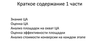 Документ описывает основы интернет-рекламы и включает этапы подготовки рекламной кампании, такие как формулирование целей, оценка целевой аудитории и выбор каналов. Также рассматриваются методы оценки эффективности рекламы и значимость анализа статистики, включая CTR, CPM и CPC. В конце документа подчеркивается важность личного общения и профессиональной сети для успешного ведения бизнеса.