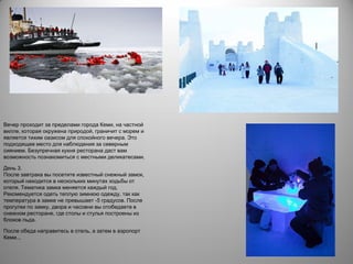 Документ описывает трехдневное зимнее приключение в Кеми, которое включает катание на снегоходах, круиз на ледоколе 'Сампо' и посещение знаменитого снежного замка. Участники получают зимнюю одежду, проходят обучение управлению снегоходом и оленьей упряжкой, а также могут насладиться местной кухней и северным сиянием. В конце путешествия гости обедают в ресторане из снега перед возвращением в аэропорт.