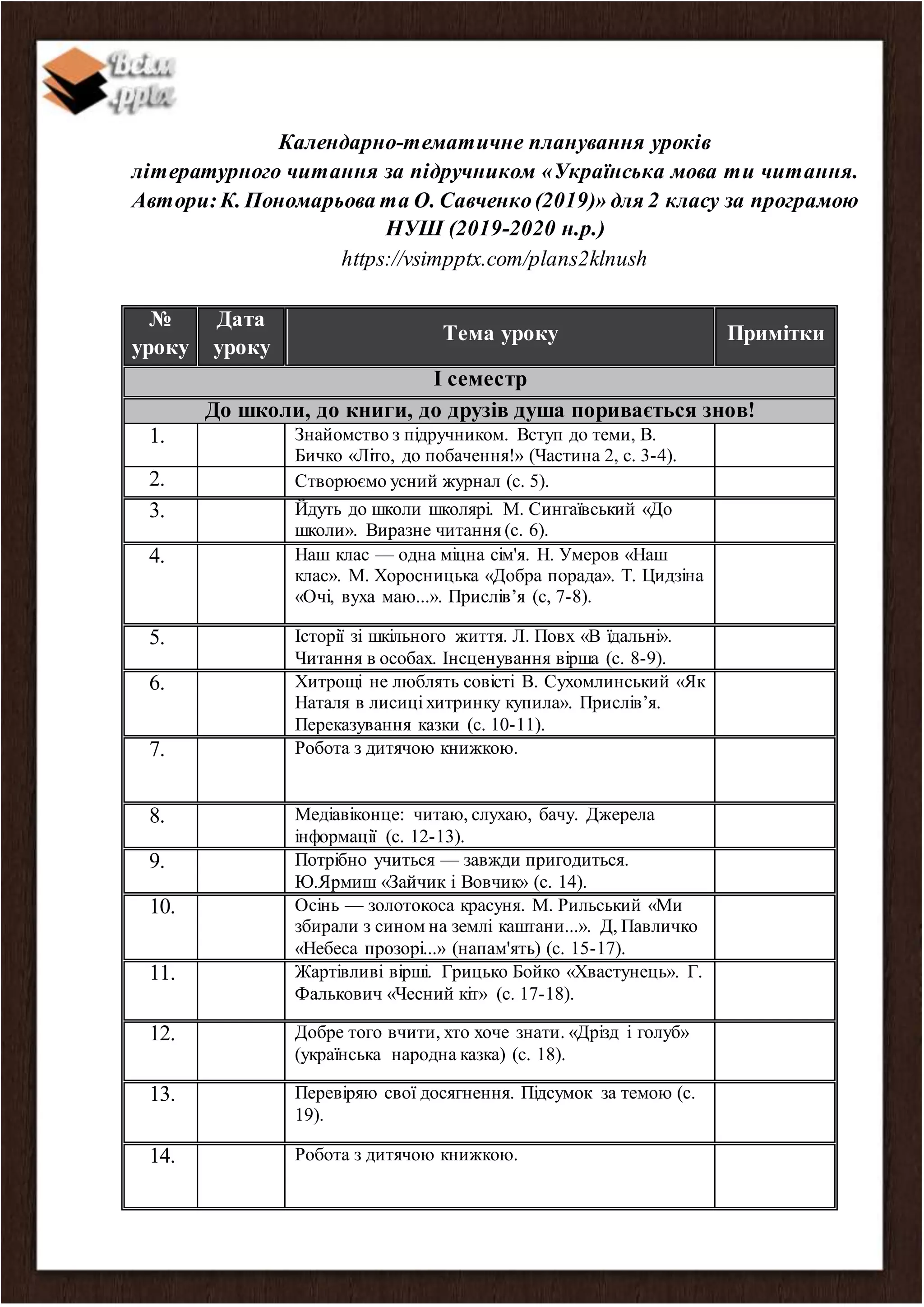 Календарно-тематичне планування - Літературне читання для 2 класу за О. Савченко (І семестр)