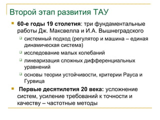 Документ описывает три этапа развития теории автоматического управления (тау). Первый этап характеризуется отсутствием теоретических исследований, второй этап включает работы Максвелла и Вышнеградского, а современный этап с 60-х годов XX века фокусируется на оптимизации управления и использовании современных аппаратных средств. Также рассматриваются различные модели управляемых процессов, включая линейные и нелинейные системы.