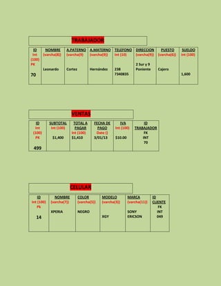 ID NOMBRE A.PATERNO A.MATERNO TELEFONO DIRECCION PUESTO SUELDO