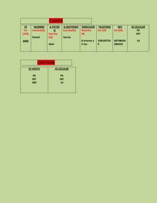 Int (100) (varcha(7)) (varcha(5)) (varcha(3)) (varcha(11)) CLIENTE