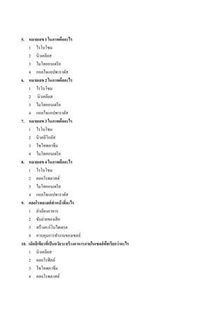 ในภาพคืออะไร 1 ไรโบโซม 2 นิวเคลียส 3 ไมโทคอนเดรี ย 4 กอลไจแอปพำรำตัส 6. หมายเลข 2 ในภาพคืออะไร 1 ไรโบโซม 2 นิวเคลียส 3 ไมโทคอนเดรี ย 4 กอลไจแอปพำรำตัส 7. หมายเลข 3 ในภาพคืออะไร 1 ไรโบโซม 2 นิวคลีโอลัส 3 ไซโทพลำซึม 4 ไมโทคอนเดรี ย 8. หมายเลข 4 ในภาพคืออะไร 1 ไรโบโซม 2 คลอโรพลำสต์ 3 ไมโทคอนเดรี ย 4 กอลไจแอปพำรำตัส 9. คลอโรพลาสต์ ทาหน้ าที่อะไร 1 ลำเลียงอำหำร 2 ขับถ่ำยของเสี ย 3 สร้ำงคำร์ โบไฮเดรต 4 ควบคุมกำรทำงำนของเซลล์ 10. เม็ดสี เขียวทีเ่ ป็ นอวัยวะสร้ างอาหารภายในเซลล์พชเรียกว่ าอะไร ื 1 นิวเคลียส 2 คลอโรฟิ ลล์ 3 ไซโทพลำซึม 4 คลอโรพลำสต์